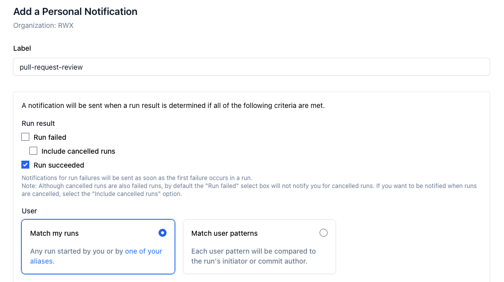 For example, you might dispatch a run to request a review when a pull request run completes successfully. To do this, create a notification in RWX.