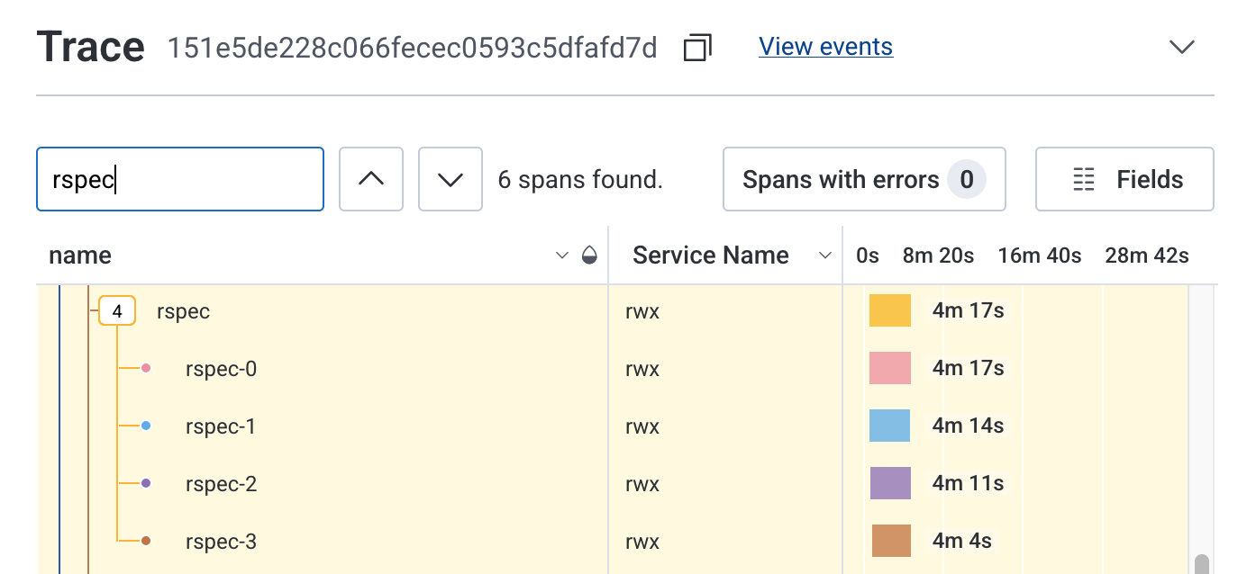 RWX can link directly to the Honeycomb spans within the waterfall trace view. To construct links directly to your Honeycomb spans, we need the following:
